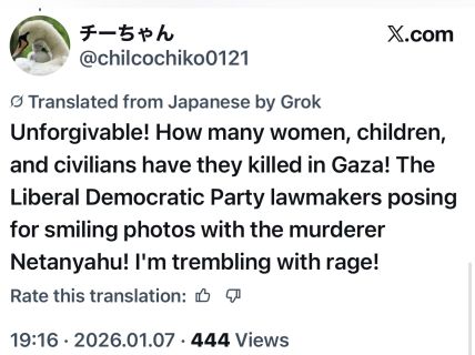 وكتب معارضون يابانيون تعليقات على اكس نددوا فيها بالزيارة. وقال أحدهم "على أعضاء الوفد الذين يؤيدون الإبادة الجماعية البقاء في إسرائيل وعدم العودة إلى اليابان". وكتب آخرون "لماذا لا يقضي أعضاء الوفد عدة أيام في غزة أو الضفة الغربية". وكتب أحدهم "حتى لو أعرب رئيس الوزراء نتنياهو عن امتنانه لليابان، أنا أرفض ذلك من زعيم دولة ارتكبت إبادة جماعية". وأضاف ياباني آخر، "أعتقد ان زيارة وفد النواب اليابانيين تواطؤ في الإبادة الجماعية التي تنفذها إسرائيل ضد الفلسطينيين. وأطالب بفرض عقوبات اقتصادية على إسرائيل في أسرع وقت. وعدم إفلاتها من العقاب". وكتب ياباني "أوقفوا الإبادة في غزة! فلسطين حرة".